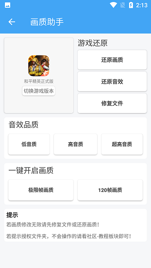 2、进入之后,可点击“切换游戏版本”,选择手机当前已安装的版本,如此一来,设置各类辅助功能时方能生效。
