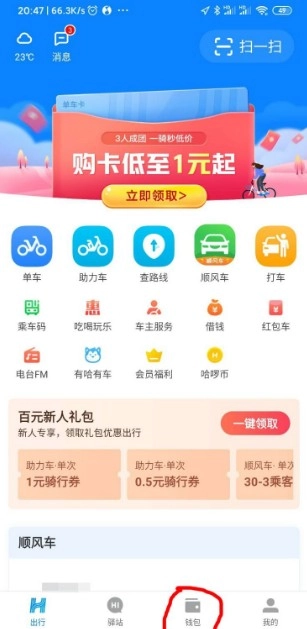打开哈啰首页,点击【钱包】。