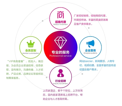 推出酒商招聘及酒商会员等服务渠道,为企业的招商代理、信息获取、宣传展示、沟通传播、人才招聘、产品众筹、品牌论坛等工作提供私人定制的尊享服务。