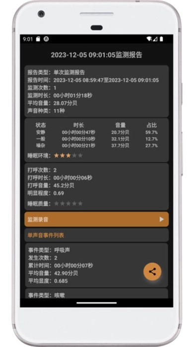 能够监测睡眠时的各类环境噪音,对睡眠环境质量进行评估,还能生成相关报告;