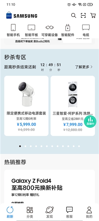 在首页里,我们可以浏览三星旗下的各类智能设备,页面下方还设有秒杀专区。