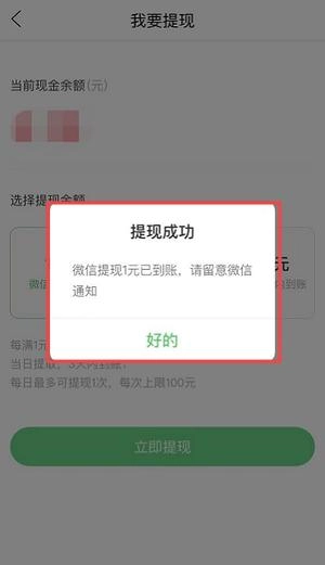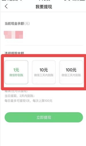 第五步:在提现页面有三种提现额度可选,第一种是1元,可立即提现至微信;第二种为10元,第三种是100元,这两种提现金额需要3天内到账。选择好想要提现的金额后,点击页面底部的“立即提现”按钮即可。