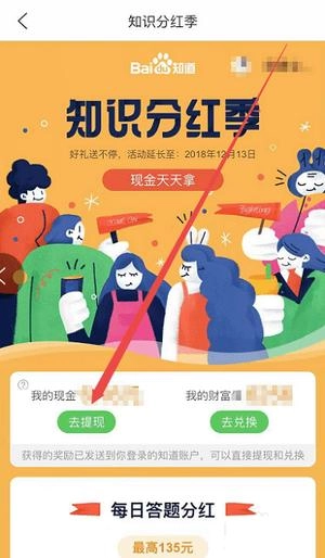 第二步: 进入百度知道首页后,可点击右上角的“领现金”入口,也能通过底部的“我”进行提现操作,此处选择“领现金”方式完成提现。