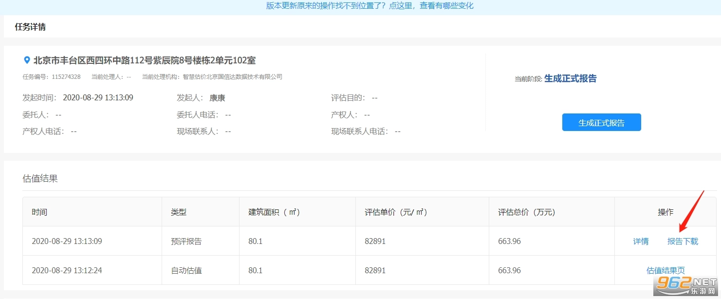 在自动估值结果页面,点击“生成正式报告”按钮,填写对应的任务信息后,系统就会自动生成正式报告。