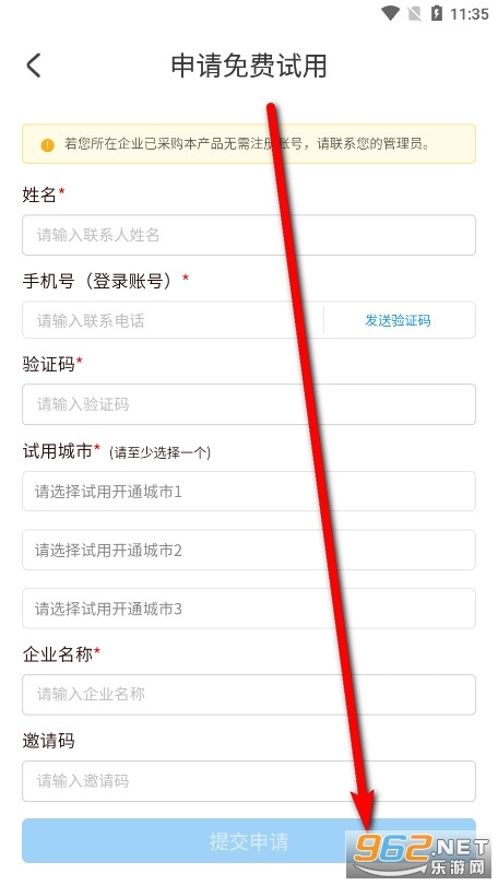 您只需依次输入姓名、手机号并获取验证码,勾选试用相关选项,填写企业名称与邀请码后提交申请,待获得账号注册登录资格,即可开启免费试用。