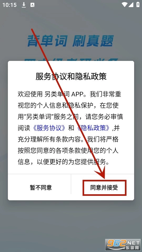 先安装“另类单词”应用,打开后依次点击“同意并接受”按钮,以及同意相关的隐私政策。