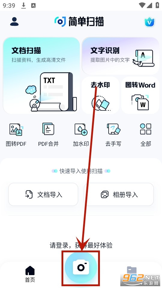 在简单扫描的首页,点击中间的拍照按钮就能进行拍照识别。