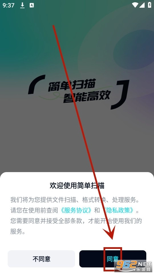 安装并打开简单扫描,点击【同意】同意隐私政策