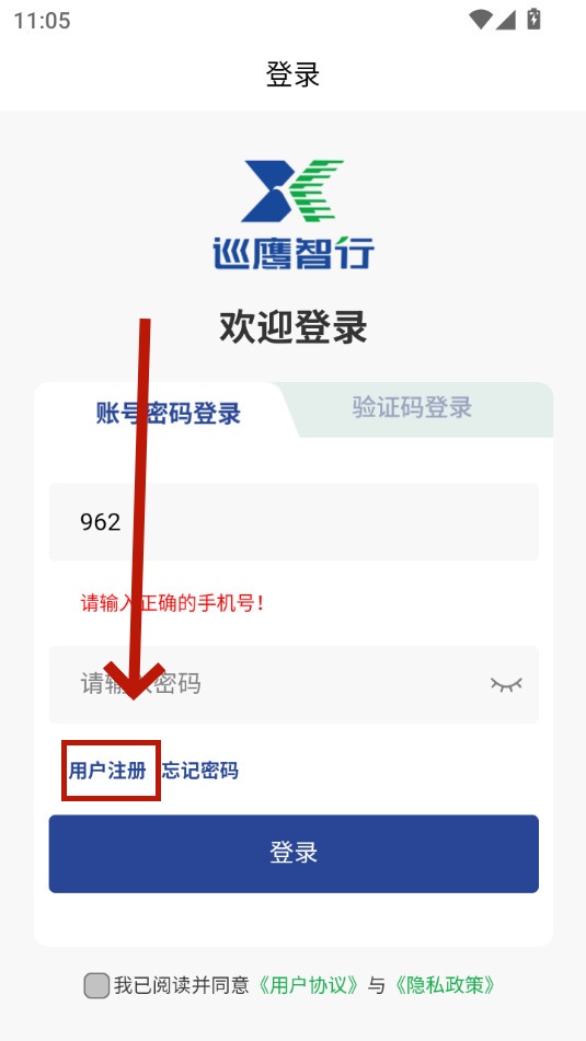 请先安装巡鹰智行应用,安装完成后打开它,接着在页面上找到“同意并继续”按钮并点击。