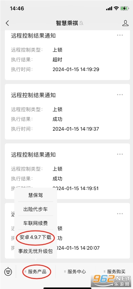 打开智慧乘祺公众号,点击“服务产品”栏目下的“安卓4.9.7”选项。