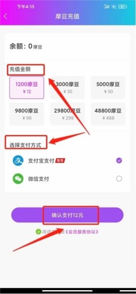 第四步,进入摩豆充值页面,挑选充值数额、选定支付途径,点击【确认支付】按钮就可以了。