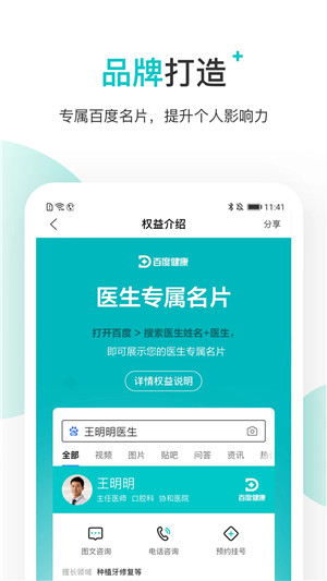 百度健康提供亿级流量扶持,依托百家号、百度百科、直播等百度旗下平台作为支撑,并配备多种医生专属权益,全方位助力医生塑造个人品牌。