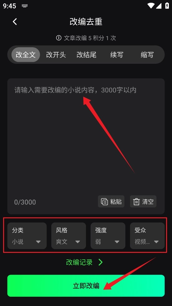 此外,该软件具备改编去重功能。具体操作如图所示:在输入框中填入待改编的小说内容,接着选择分类、风格、强度、受众等相关属性,最后点击“立即改编”按钮即可完成操作。