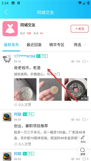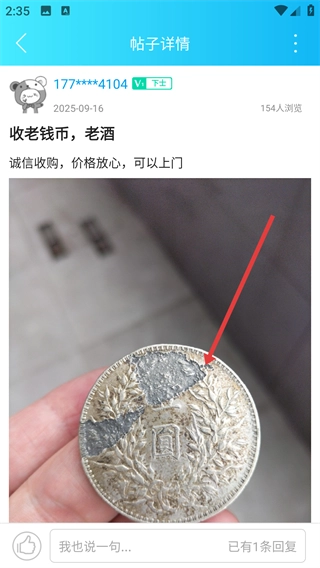 在同城交友板块里,挑选目标帖子(例如“收老钱币,老酒”这类),然后进入该帖子的详情页面。