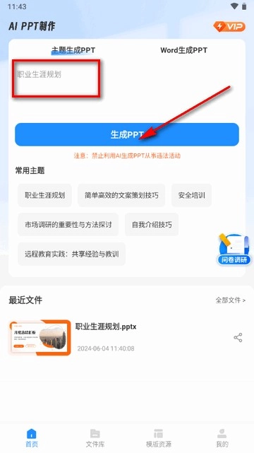 进入首页后,输入生成的主题,点生成ppt。