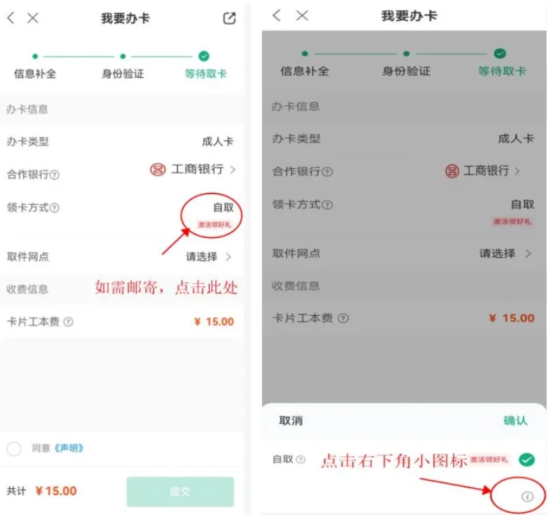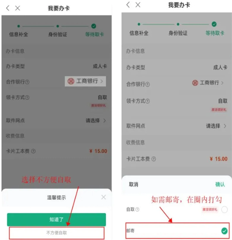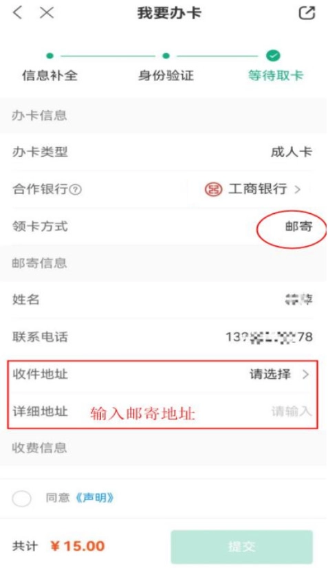 选择合作银行、领卡方式-选择邮寄需填写邮寄信息