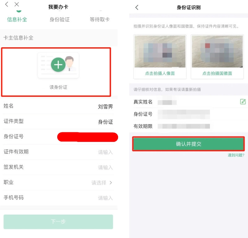 点击读取身份证→取出申领人本人的身份证→拍摄正反两面并完成上传