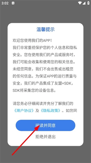 在温馨提示弹窗中,点击阅读并同意,进入。