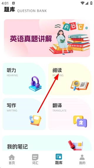 在题库页面点击“阅读”选项,即可进入阅读真题课程的选择界面。