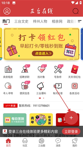 打开三台在线后,点击页面右下角的红色“+”按钮,就能展开功能选项。
