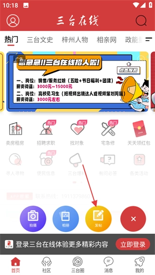 在展开的功能选项里,点击发帖按钮就能进入发帖操作界面。