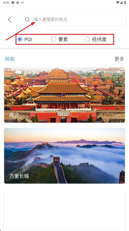 在搜索页面输入需查找的地点后,能够选择【POI】【要素】【经纬度】这几种搜索类型。