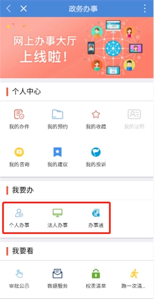 进入系统后,可根据自身需求选择【个人办事】、【法人办事】或【办事通】选项。