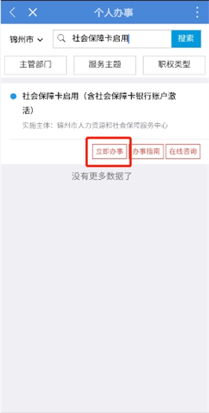 在搜索框中输入“社会保障卡启用”,接着点击【搜索】按钮,然后选择【立即办事】选项。