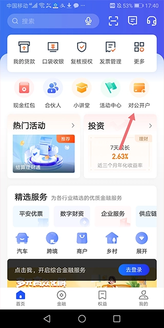 用户可以在我们平台的平安数字口袋进行操作,在手机上完成安装并打开应用后,进入首页点击【对公开户】选项。