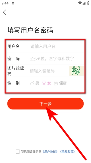 在用户名密码填写页面,依次输入用户名、密码并选择性别后,点击“下一步”按钮。