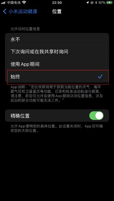 切换到下方的设备标签页,就能看到蓝色的提示信息,点击“去开启”进入设置界面。选择最上方的选项,进入后将“使用App期间开启”调整为“始终”,这样问题就彻底解决啦!!!