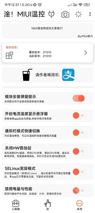 点击“其他”选项,能够查看模块相关信息,还可以开启或关闭下面的各类模式,另外也能通过支付宝请作者喝可乐。