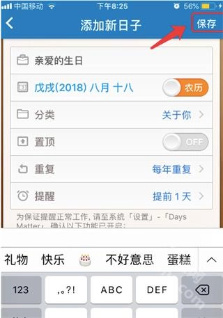 完成设置后,点击屏幕顶部的保存按钮,就能成功添加倒数日了。
