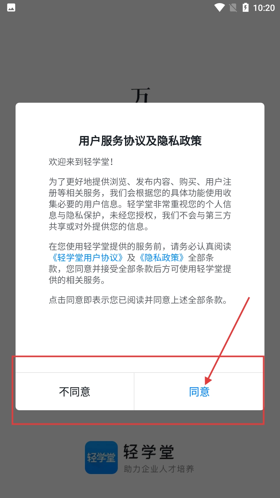 在使用轻学堂之前,请先阅读《用户服务协议及隐私政策》。若您同意协议内容,请点击“同意”按钮,之后即可进入平台使用相关功能。