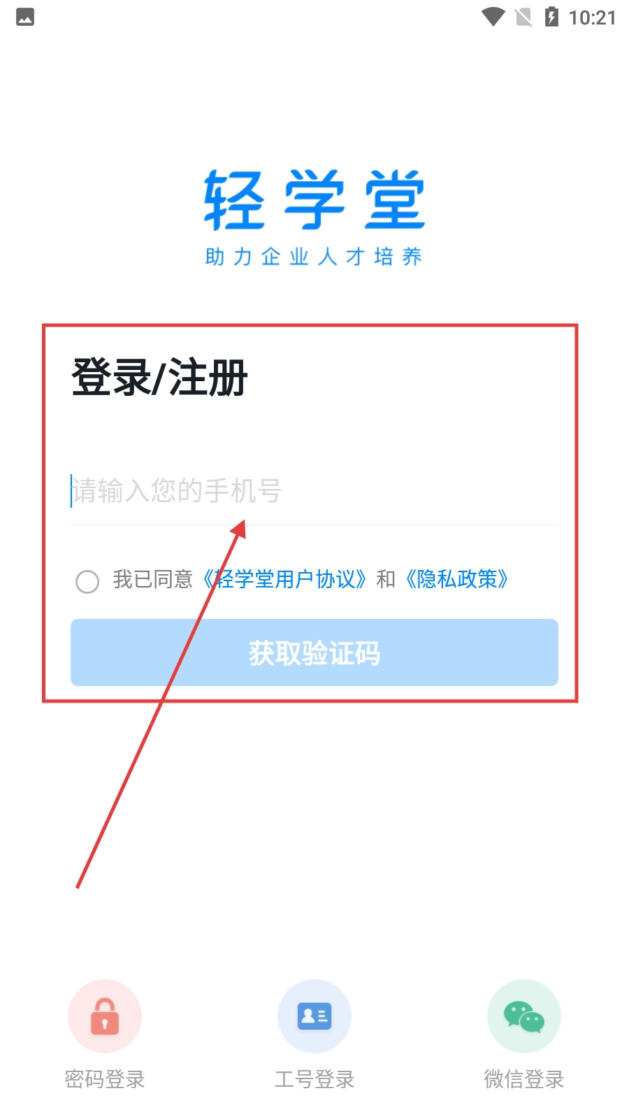 进入轻学堂的登录或注册页面后,先输入手机号,接着勾选同意相关协议,随后点击【获取验证码】按钮,这样就能进入验证码输入页面了。