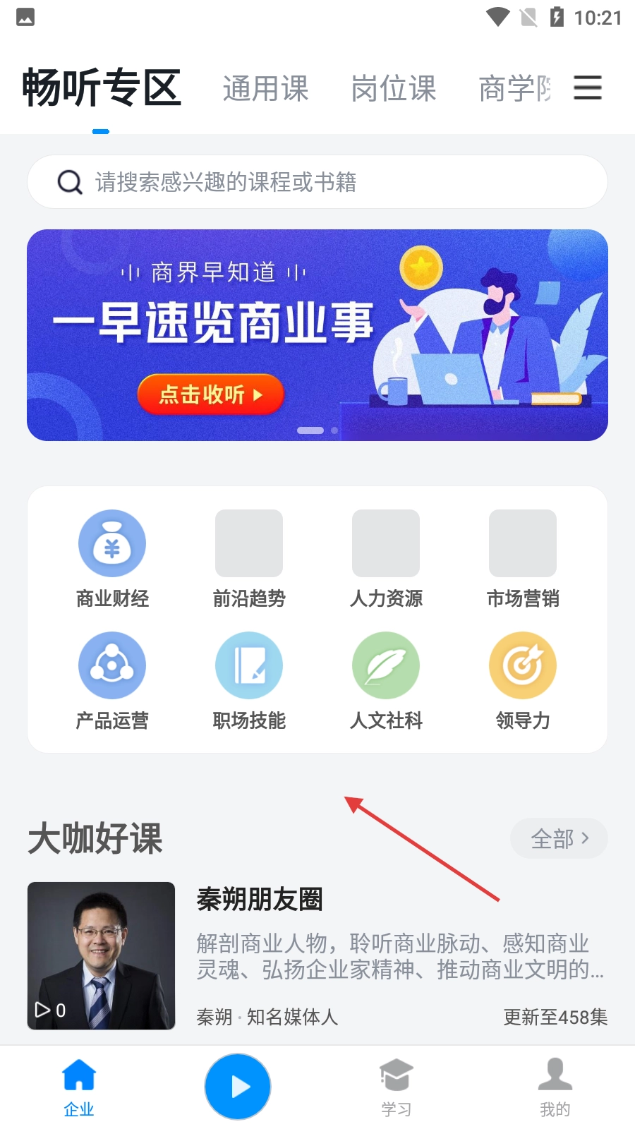 进入首页的畅听专区,你可以挑选商业财经、职场技能等各类课程或书籍来学习,还能关注大咖好课,以此提升自身能力。