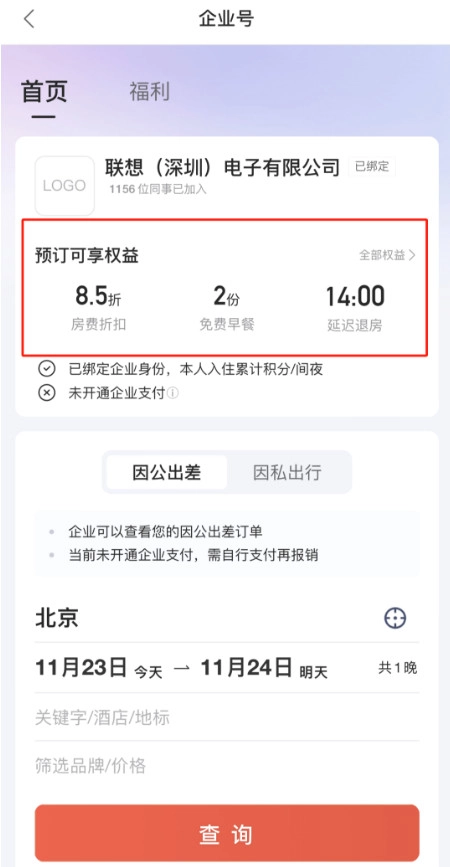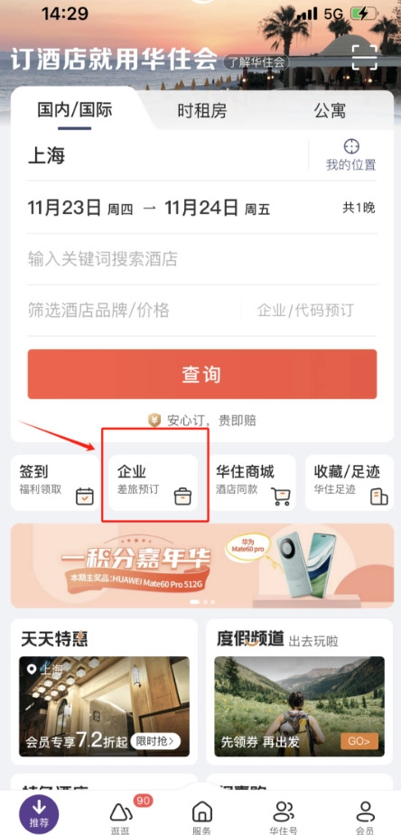 华住会平台的酒店均享直销优惠价,价格更具优势;从预订到入住,我们提供全流程的贴心服务,打造一站式优质住宿体验;企业客户还可享受专属“企业号”服务,实现差旅流程闭环管理,员工无需垫资和报销,入住即可获得积分与优惠券。