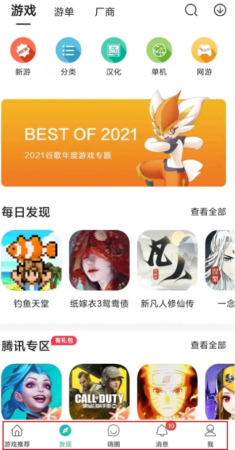 底部设有“游戏推荐”“发现”“嗨圈”“消息”和“我的”几个板块