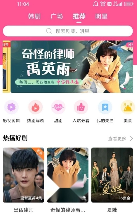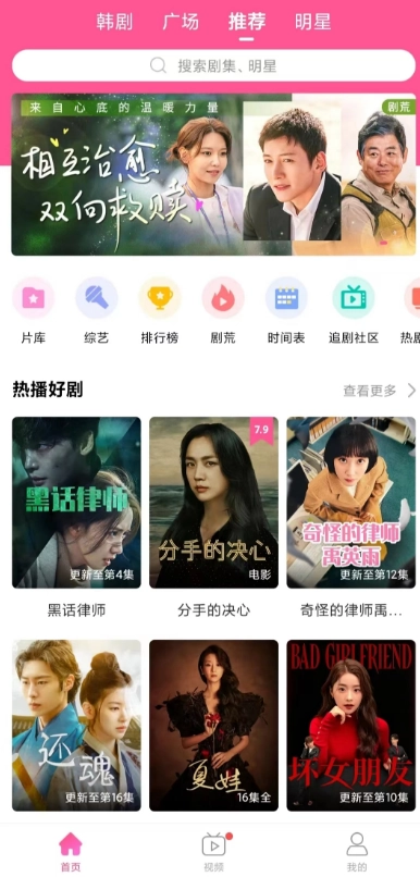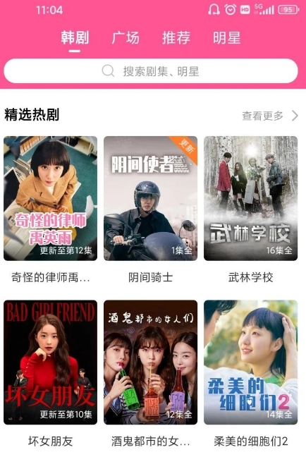安装完成后,会有韩剧、广场、推荐、明星这几个栏目,大家可以依据自己的喜好来挑选对应的栏目。
