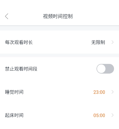 在视频时间控制界面,能够设定每次观看的时长,还可以设置禁止观看的时段。