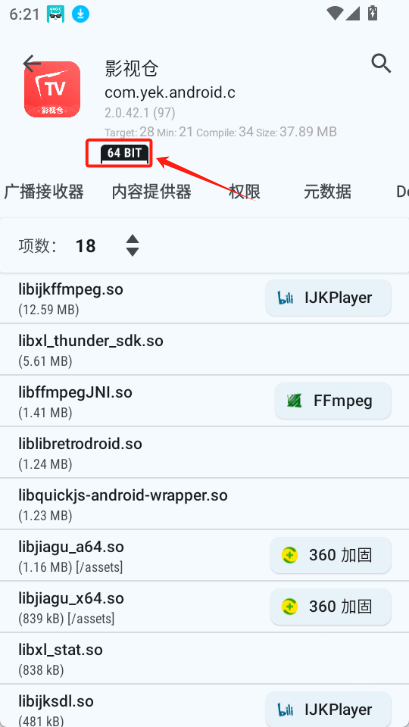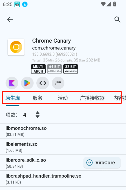 安装LibChecker后,只需点击任意应用,就能查看该应用的位数信息,还有包含原生库、服务、广播接收器等在内的其他详细内容。
