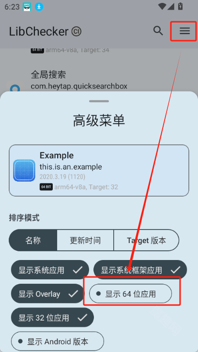 你也可以直接点击应用右上角的【三】图标,取消勾选“显示64位应用”的选项,这样就只会展示32位应用了。