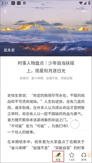 紧接着进入纸条详情页,点击底部“练笔”图标;