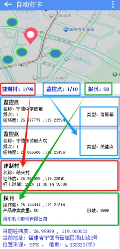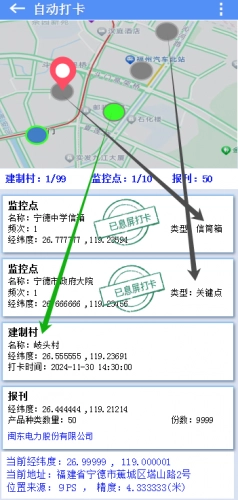 打卡完成后,监控点与建制村的状态会标记为“已息屏打卡”,此时打卡成功对应的范围标识会从蓝色圆圈变为灰色圆圈(详见下图5);而报刊类的总数据会自动完成打卡并消失;若点击未打卡的数据条,相应的打卡范围标识则会切换为绿色圆圈(见下图)。