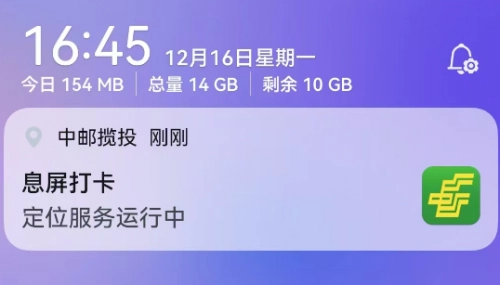 ① “息屏打卡”功能的开启与关闭:当PDA或手机的屏幕处于息屏状态时,能够自动完成打卡采集操作。若开启该功能,PDA或手机程序外屏的上部区域会显示“中邮揽投·息屏打卡,定位服务运行中”的提示信息,具体显示效果可参考下方图示。