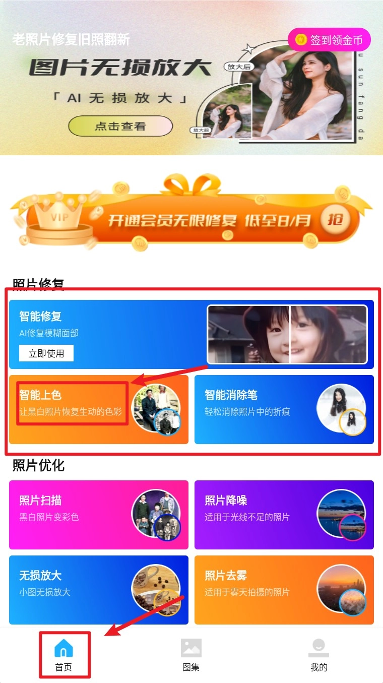 回到首页后,在照片修复板块里找到智能上色功能并点击,接着就会进入黑白图像上色的图层界面。