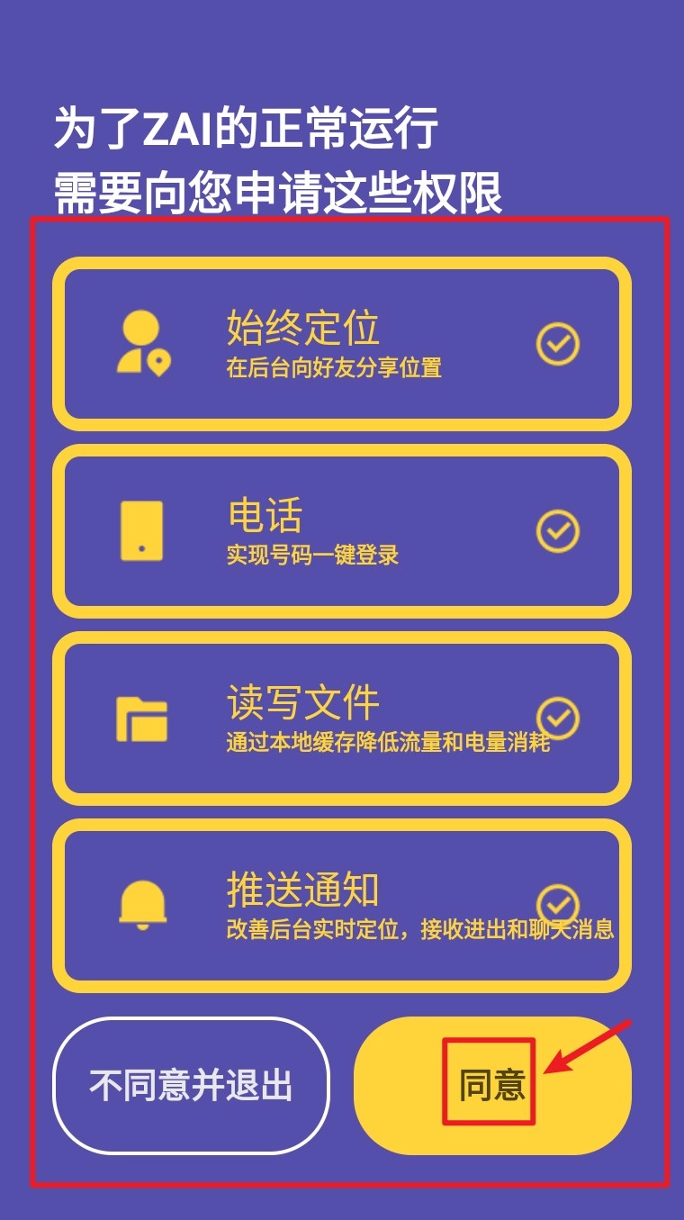 首次打开应用时,请点击同意授权定位、登录、存储、推送这四项权限,以保障这些功能能够正常运行。