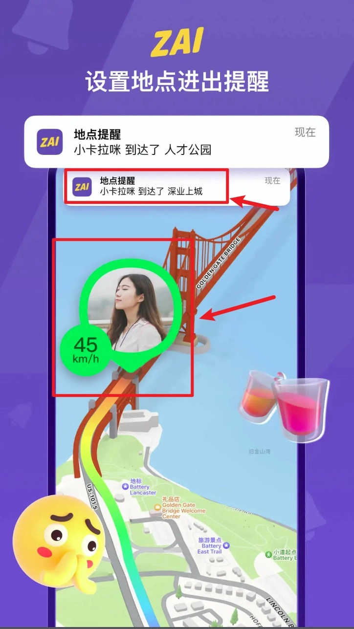 开启地点提醒功能,挑选好友并添加提醒地点,对方进出该地点时,你会自动收到通知。