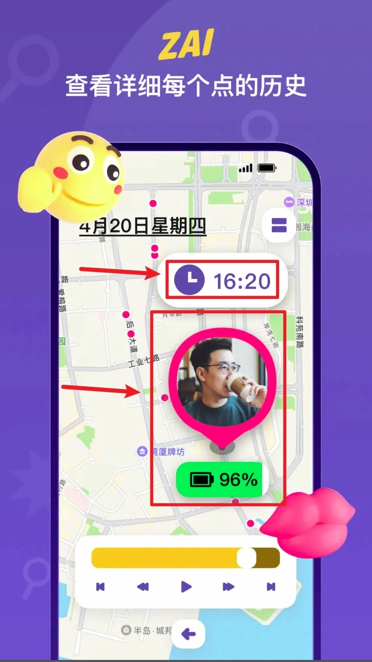 点击底部的历史时间轴,就能查看好友每日的路径轨迹和停留记录。