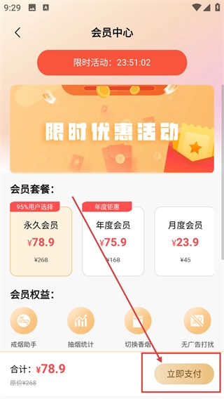 在会员中心选定套餐后,点击【立即支付】按钮,即可跳转至确认订单页面,为后续完成支付流程做准备。